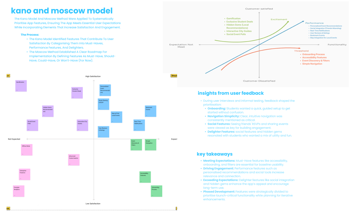 The Kano Model helped distinguish between basic expectations (like clear navigation), performance features (such as budget filters and interactive maps), and delighters (like seeing which friends are attending events). This framework was instrumental in shaping features that not only met students’ functional needs, but also created moments of surprise and delight, essential for engagement.