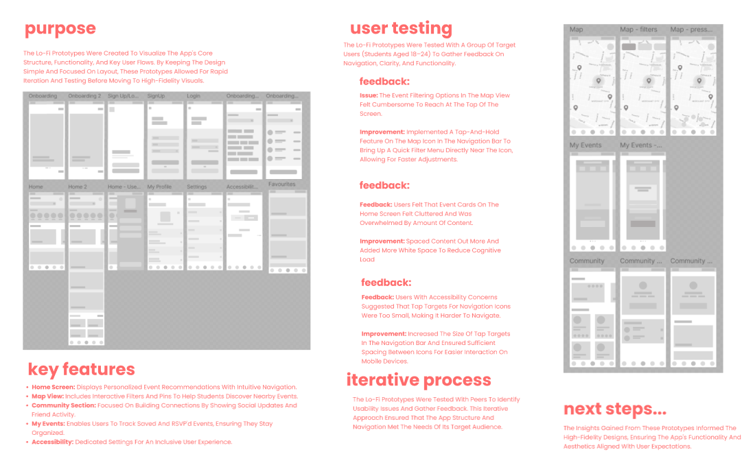 To begin, I conducted a mix of primary and secondary research to understand how students aged 18–24 engage with events, social activities, and local culture. Surveys and interviews revealed that students heavily rely on mobile apps and peer recommendations, yet often feel overwhelmed by event discovery or left out due to accessibility barriers. Many international students, in particular, reported difficulty navigating unfamiliar social spaces or digital tools.
