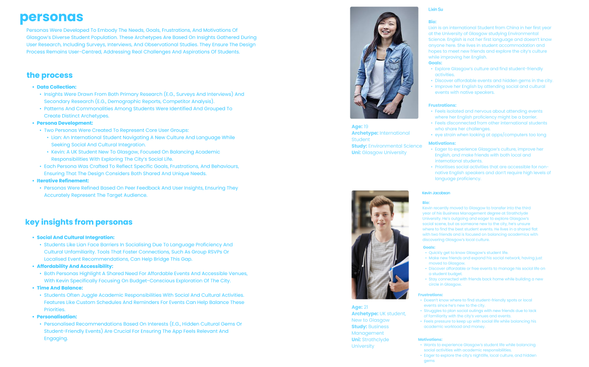 Using the findings from the Discover phase, I developed two detailed personas: Lian, an international student eager to connect socially but facing language and cultural barriers, and Kevin, a UK student balancing coursework with a desire to explore Glasgow affordably.