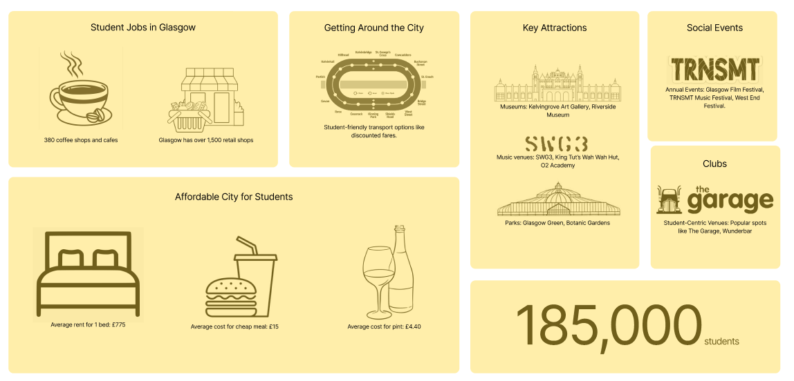 To explore Glasgow’s potential as a student engagement platform, I analysed local infrastructure, cost of living, transport access, and cultural assets. This revealed strong foundations for an app that could bridge the gap between students and the city’s offerings.