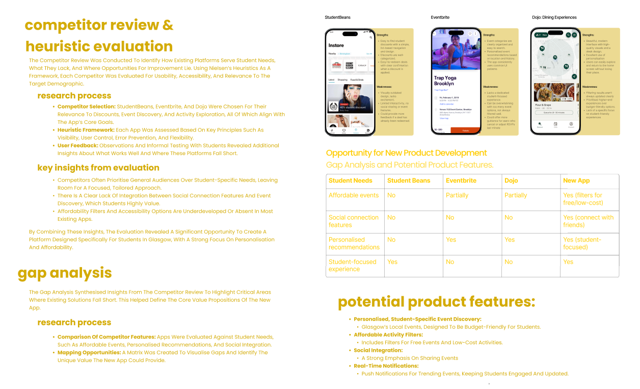 I conducted location-based research and a SWOT analysis to understand Glasgow’s unique position as a student city. With over 185,000 students, 380+ cafés, iconic music venues like SWG3 and King Tut’s, and major annual events such as TRNSMT and the West End Festival, Glasgow offers an incredibly vibrant cultural landscape. However, many students, especially newcomers, struggle to access or navigate this wealth of opportunities.