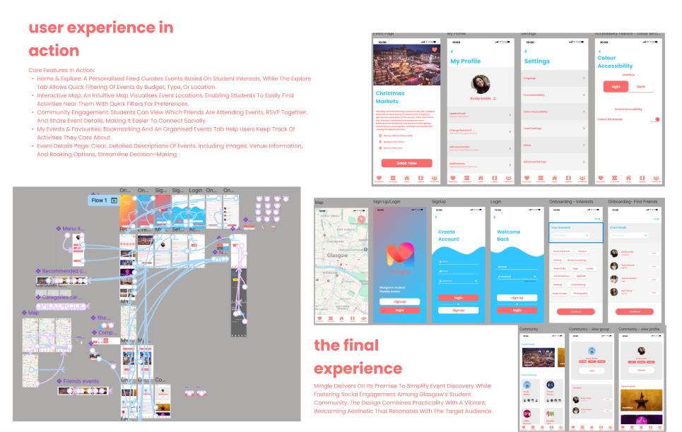 Through rapid ideation and iterative prototyping, I designed Mingle as a platform that combines personalisation, event discovery, and community features. The final solution reflects both functional clarity and emotional connection, empowering students to explore Glasgow confidently and socially.