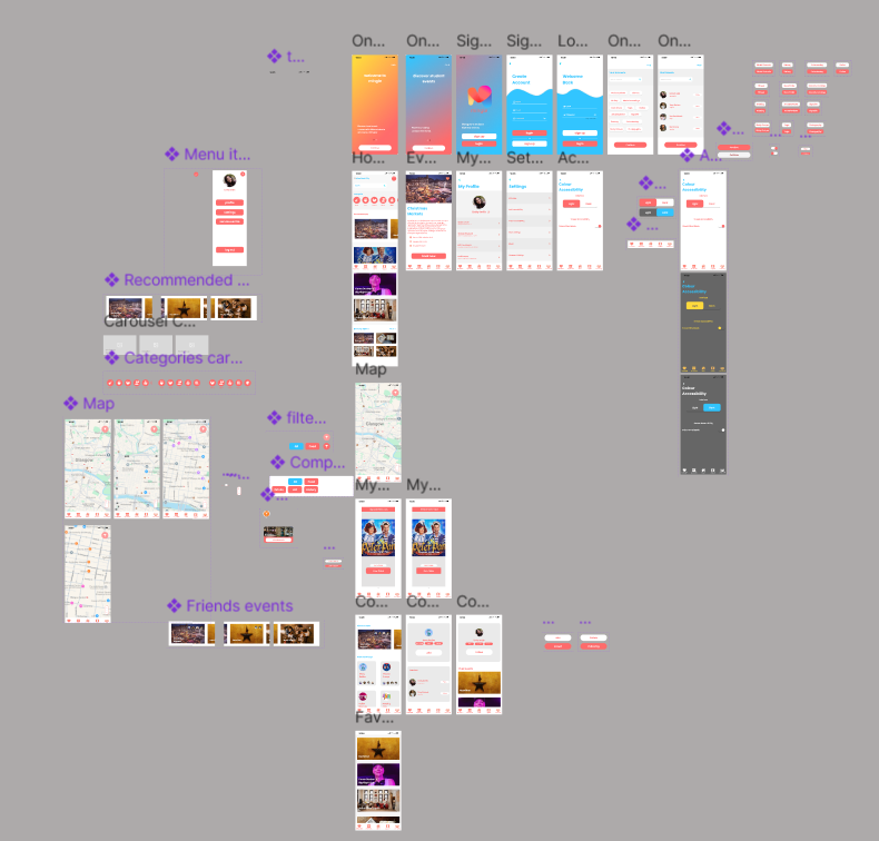 In parallel, the MoSCoW method clarified which features were Must-Have (e.g., event discovery, RSVP, accessibility settings), Should-Have (e.g., personalised feeds, interactive map filters), Could-Have (e.g., community content, badges), and Won’t-Have for now (e.g., third-party ticket integration). This ensured we stayed focused during prototyping, without overextending the initial MVP scope.