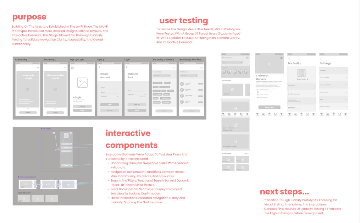 Building on low-fidelity wireframes and user flows, I transitioned into mid-fidelity prototyping to focus on interaction, layout clarity, and structural consistency. This stage allowed for more realistic testing of navigation patterns, event browsing, and booking flows without the distraction of final visuals.